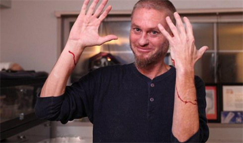 37岁的蒂姆-弗雷德为了证明自己的蛇毒免疫理论,最近正用世界上最毒的两条蛇在自己身上试验,连续让太攀毒蛇和黑曼巴蛇咬自己。而这两种毒蛇的毒液分分钟可以致命。